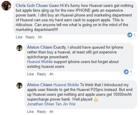 A ação, apesar de uma bela estratégia de marketing, enfureceu alguns dos clientes da Huawei, que acharam injusto os donos de iPhone serem contemplados com uma bateria externa, enquanto eles, ganharam "vários nadas".